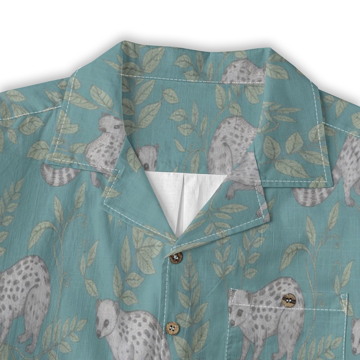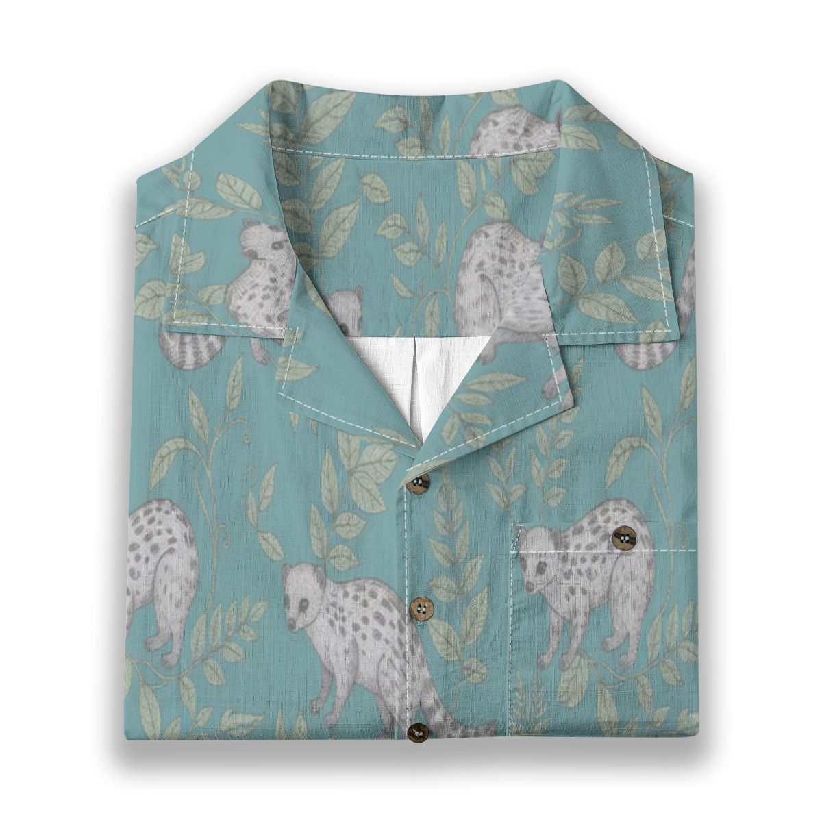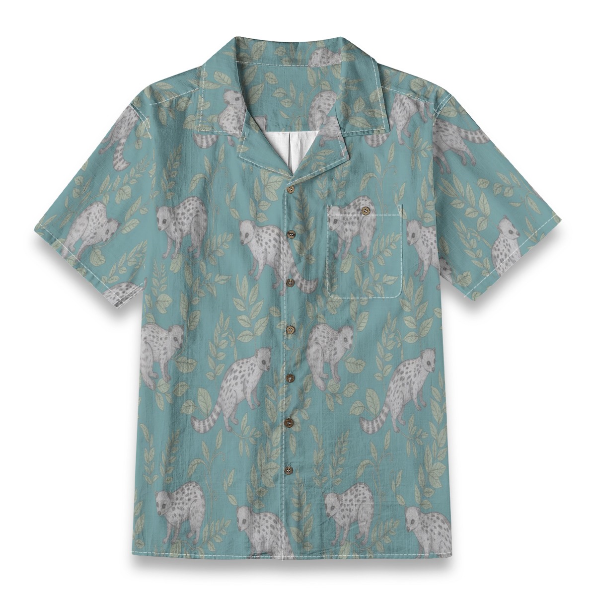 Graceful civets move through soft foliage in a gentle, balanced pattern. Cool teal tones and subtle greens create a refreshing and calm tropical aesthetic.