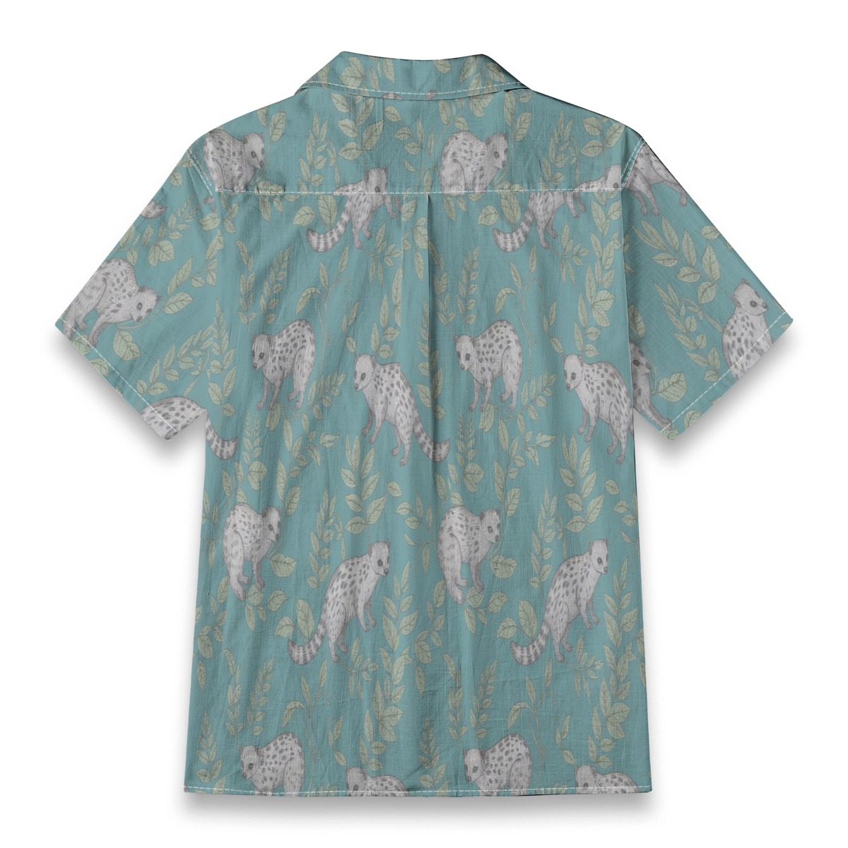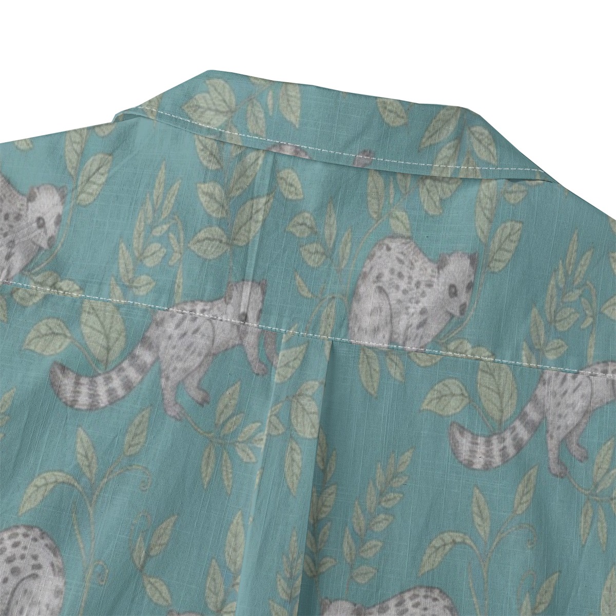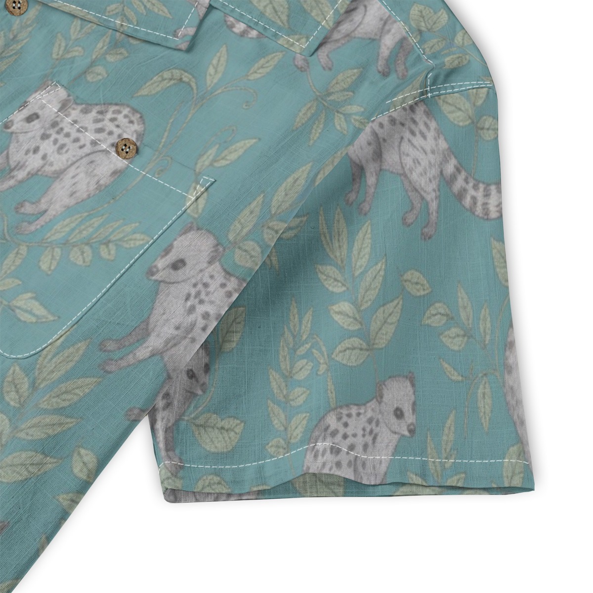 Graceful civets move through soft foliage in a gentle, balanced pattern. Cool teal tones and subtle greens create a refreshing and calm tropical aesthetic.