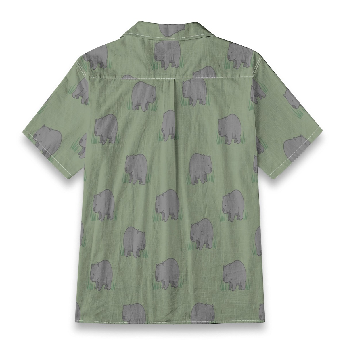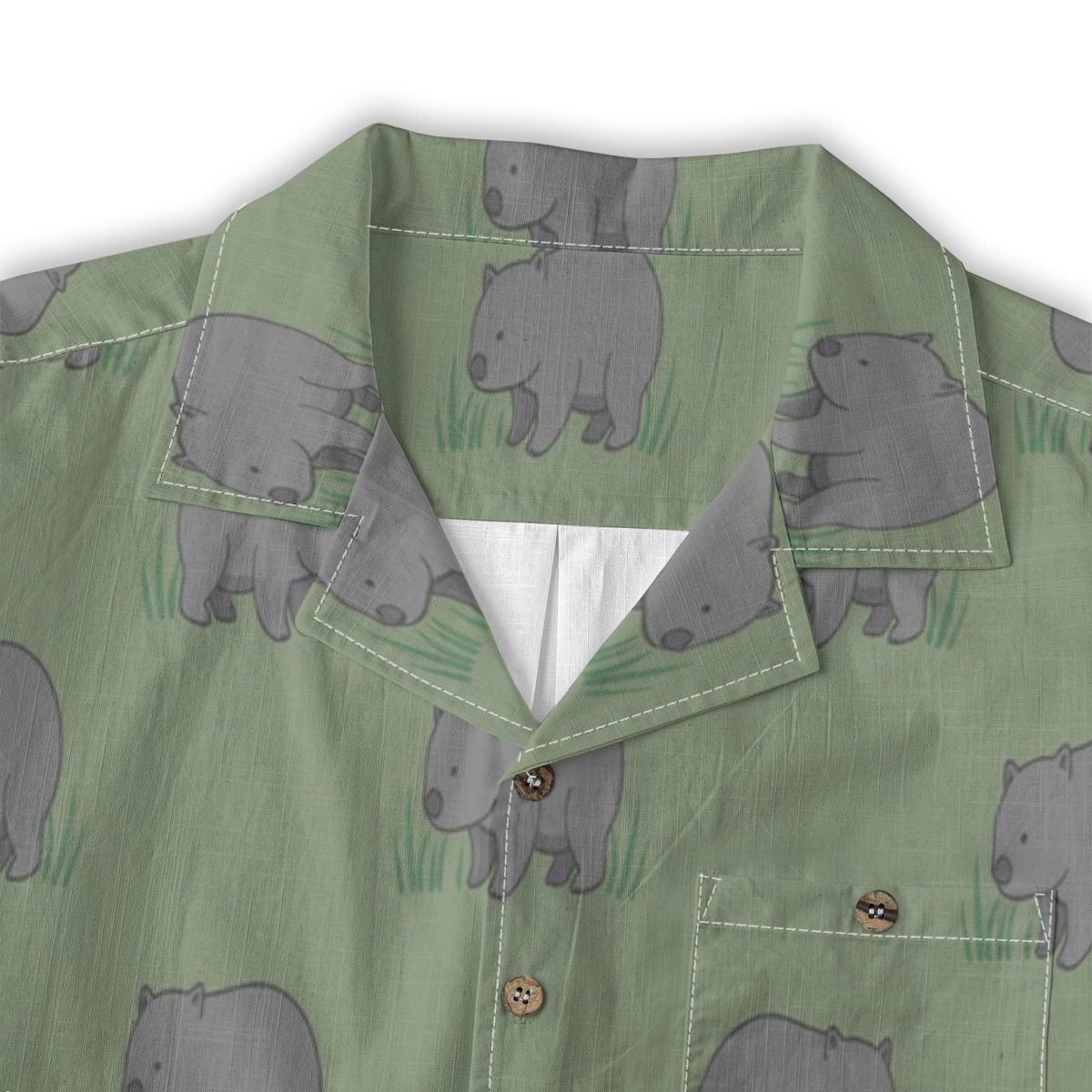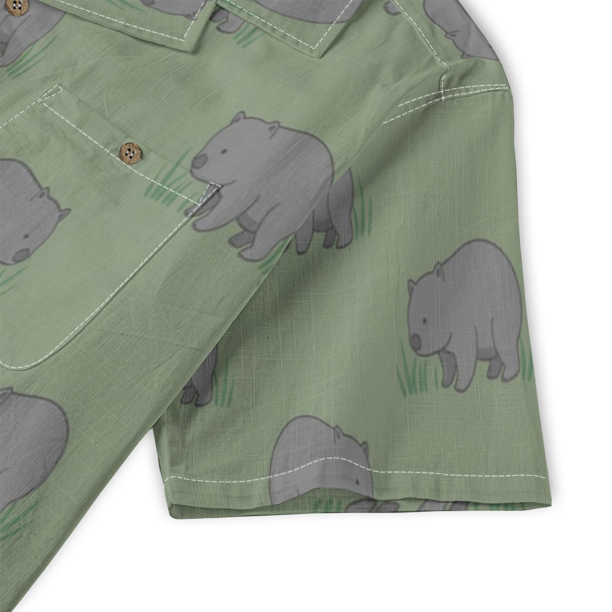 Cozy wombats rest among gentle grass elements in a calm and grounded pattern. Muted greens and soft grays create a peaceful and natural visual flow.